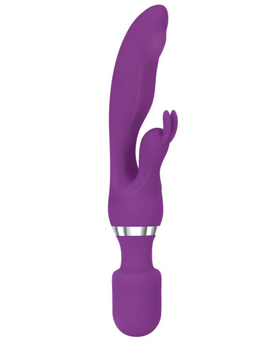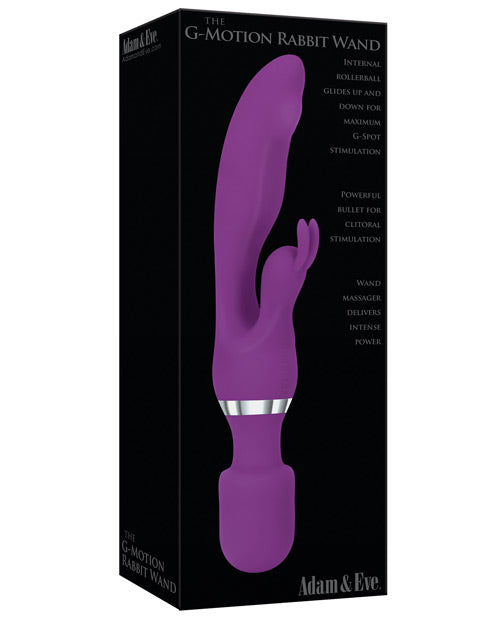 Play in so many new ways with this dual-ended 10" silicone rabbit vibe! Up top, a 3-speed rollerball inside the shaft rolls back and forth, mimicking the massage of a finger for intense G-Spot stimulation. Then let the clitoral stimulator bunny buzz you with 7 powerful vibration functions. Or turn it around and feel its bed-shaking 7 function wand massager head. Which way do you want to play today? With the Adam & Eve G-Motion Rabbit Wand, it's any way you choose. Each of this clever and stylish rabbit's stimulators has independent controls - so you can feel a G-Spot massage, clitoral stimulation, or both from the shaft and the bunny. Or you can flip this vibe over and feel toe-curling power from the wand on the opposite side. In fact, you can use all three stimulators at once - or use one end yourself while a playmate enjoys the other! Rechargeable, includes USB charging cable. Approx. 50 minutes playtime, full recharge in 3.5 hours. Waterproof and fully submersible. From Adam and Eve. 5 year warranty.