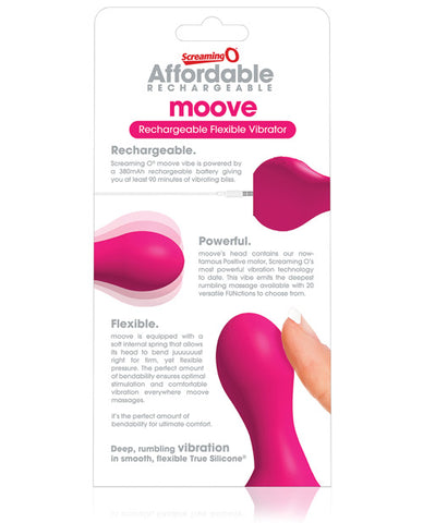 Enjoy rumbling massage that follows your every curve with the Affordable Rechargeable moove, a soft True Silicone® massager with a bulbous head and bendable neck for firm, yet flexible pleasure. Powered by deep, rumbling Vooom® vibration, moove's rounded head can swirl, zigzag, and stretch side-to-side and follow your lead with ease thanks to a small spring inside. This perfect amount of bendability ensures comfortable vibration pressure everywhere moove massages while expertly dispersing rumbly vibes from every angle. With its motor positioned within its head, moove delivers Screaming O's most powerful vibration technology to date and emits 20 powerful FUNCtions of the deepest rumble available. moove vibrates for more than 60 minutes on a single charge (USB cord included!) and is 100% waterproof for ultimate versatility.